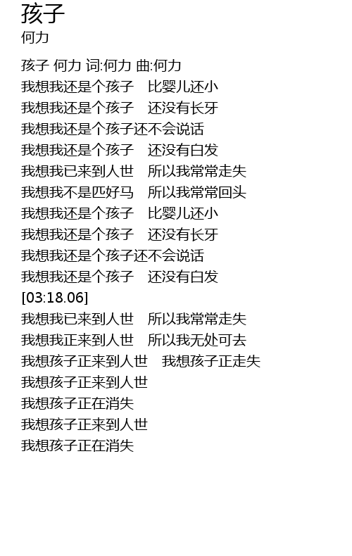 | [00:01.50] | 孩子 何力 词:何力 曲:何力 |