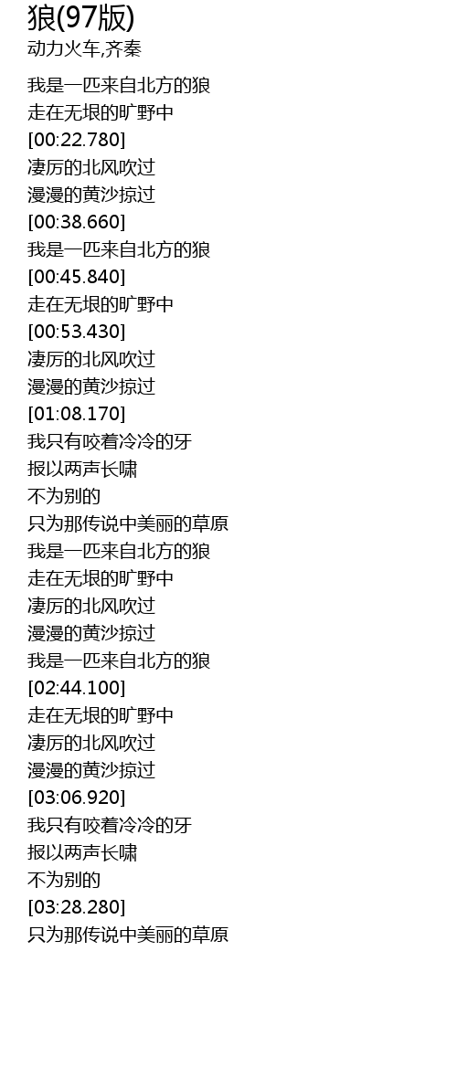 | [00:39.390] | 我是一匹来自北方的狼 |