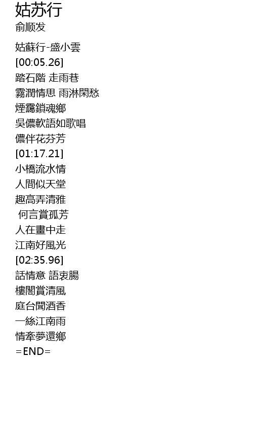 | [00:01.93] | 姑蘇行-盛小雲 |