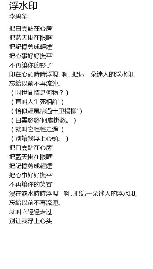 | [02:10.050] | 浸在淚水時時浮現' 啊...把這一朵迷人的浮水印, |
