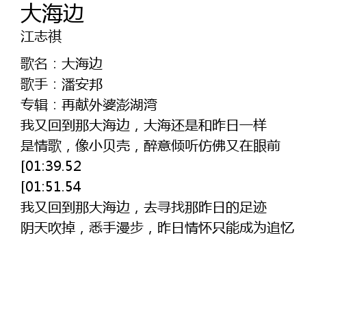 | [02:28.05][01:39.52][00:38.09] | 大海大海,你可明了,我的心中有多少悲欢 |