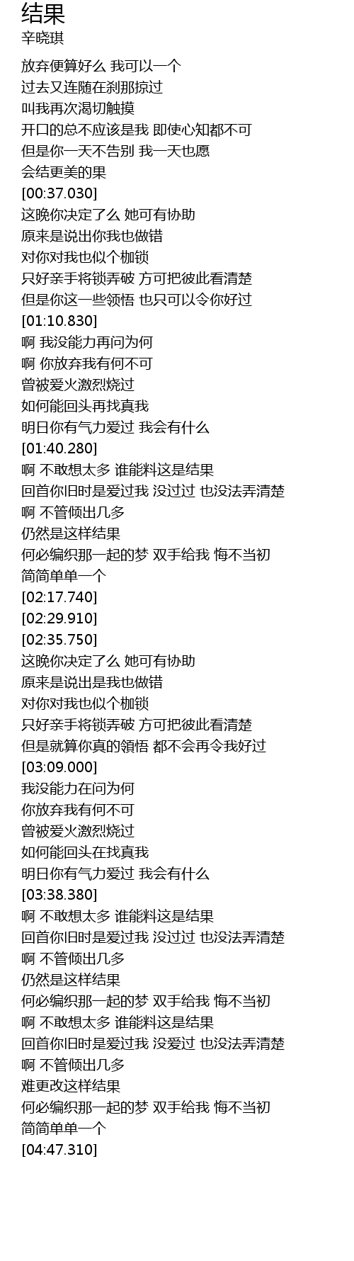 | [04:09.470] | 啊 不敢想太多 谁能料这是结果 |