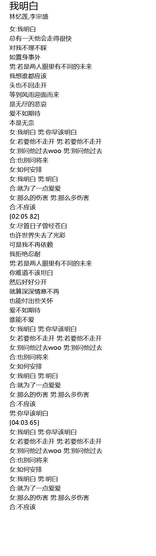 | [03:10.93] | 女:我明白 男:你早该明白 |