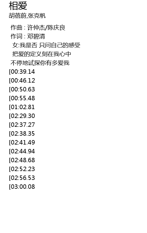 | [03:40.13][03:00.08][01:39.91] | 合:有你有我 |