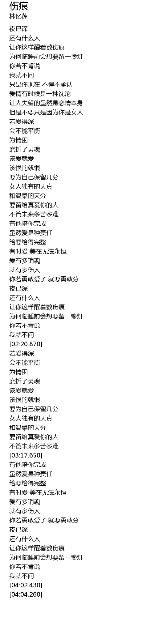 | [02:04.640] | 让你这样醒着数伤痕 |