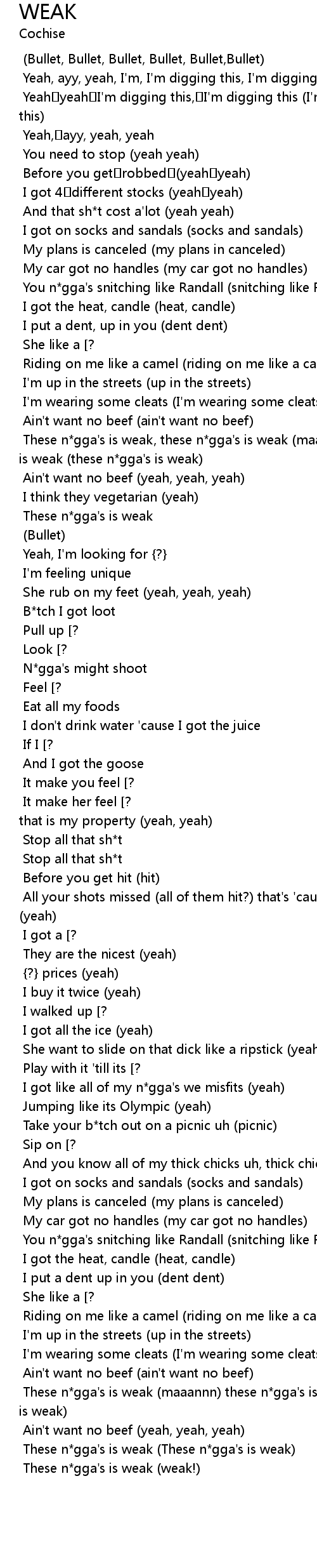 | [02:02.699] | These n gga' s is weak maaannn these n gga' s is weak these n gga' s is weak |