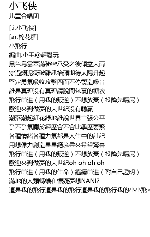 | [02:43.633] | 這是我的飛行這是我的飛行這是我的飛行我的小小飛<11437,-5,0>行 |