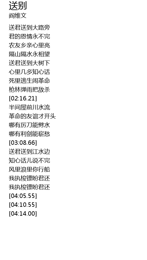 | [03:14.62] | sòng jūn sòng dào jiāng shuǐ biān |