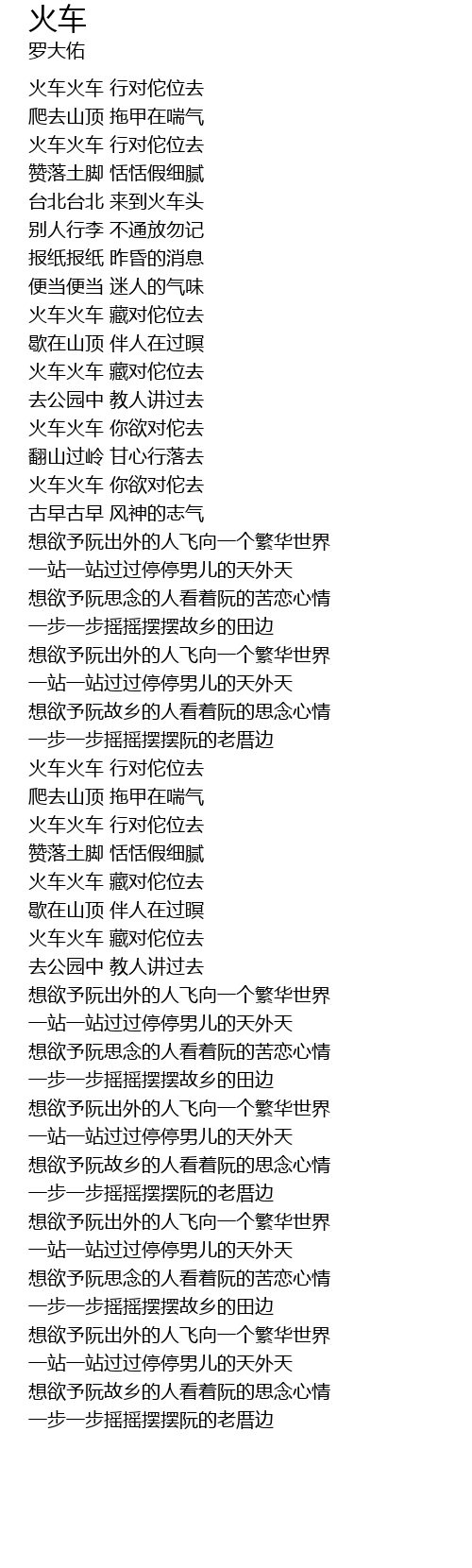 | [00:15.43] | 火车火车 行对佗位去 |