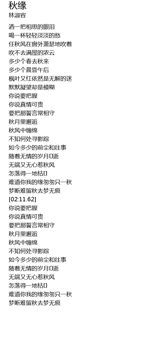 | [02:04.81] | 梦断难留秋去梦无痕 |