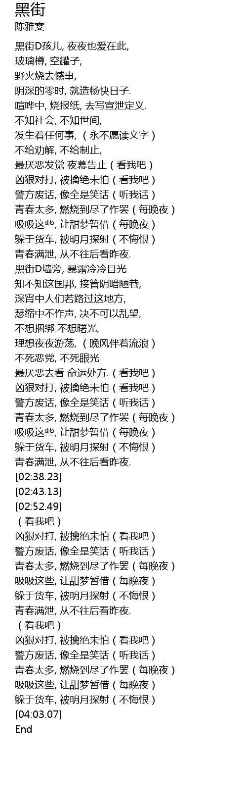 | [01:37.89] | 黑街D墙旁, 暴露冷冷目光 |