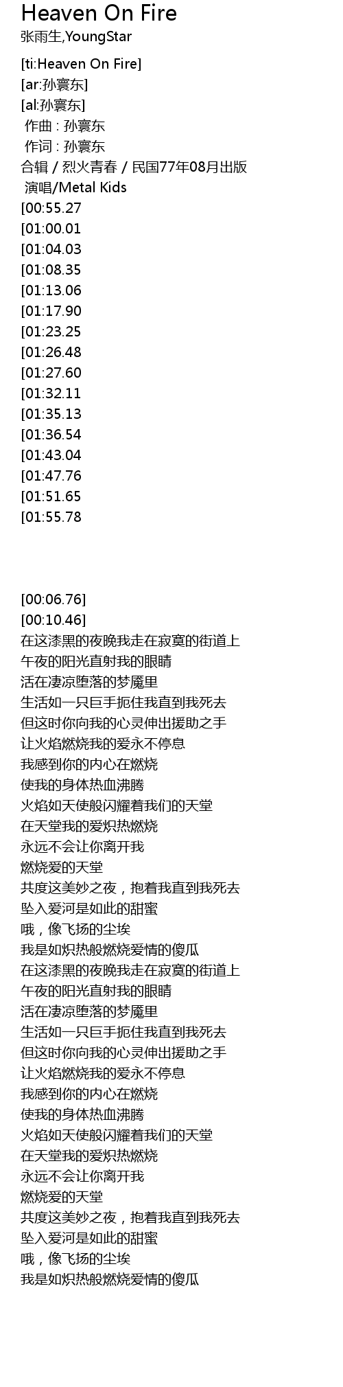 | [03:02.60][01:36.54] | Heaven on fire burning love |