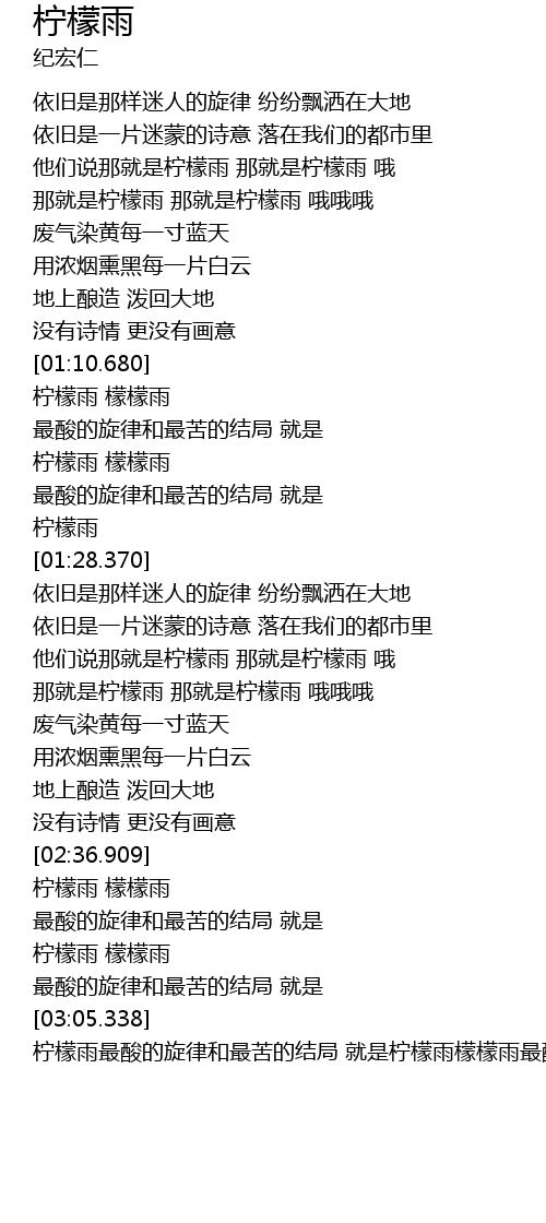 | [03:07.298] | 柠檬雨最酸的旋律和最苦的结局 就是柠檬雨檬檬雨最酸的旋律和最苦的结局 就是柠檬雨 柠檬雨檬檬雨最酸的旋律和最苦的结局 就是柠檬雨 |