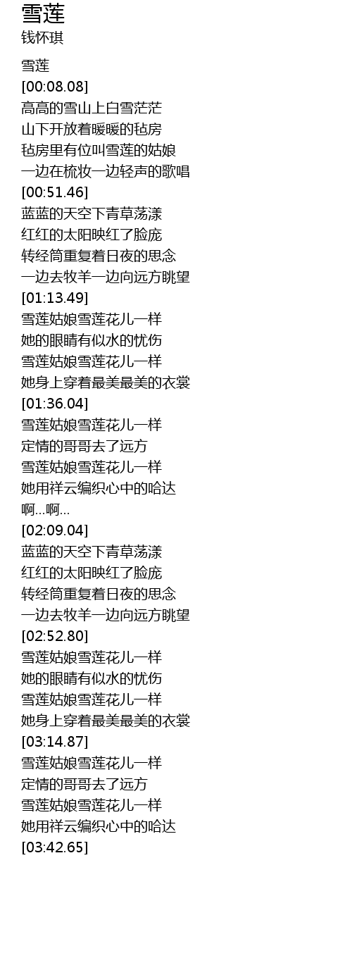 | [03:15.23] | 雪莲姑娘雪莲花儿一样 |