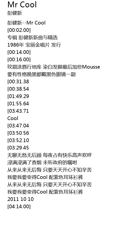 | [00:00.00] | péng jiàn xīn Mr Cool |