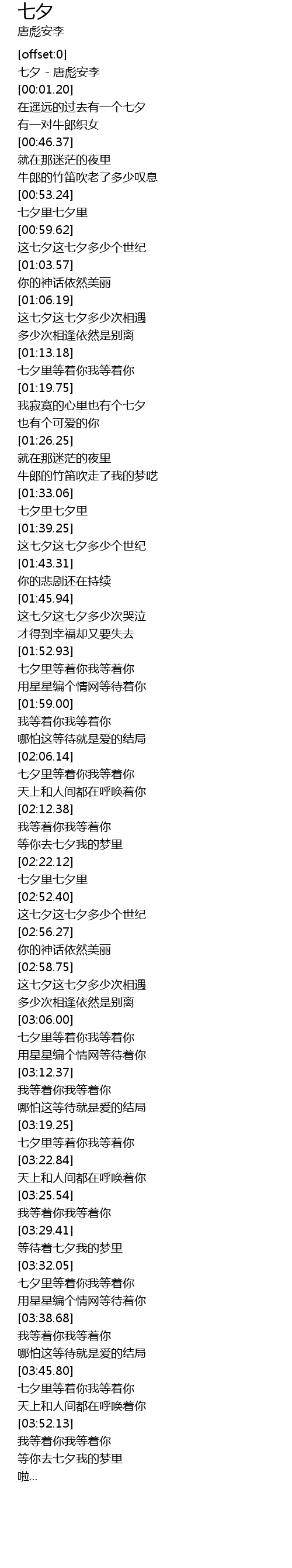 | [00:00.00] | 七夕 - 唐彪安李 |