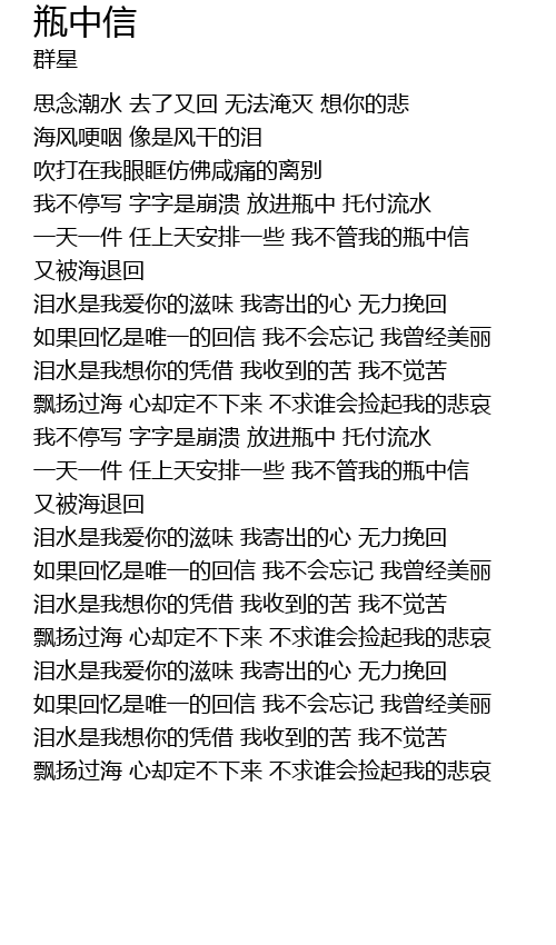 | [02:50.00] | 我不停写 字字是崩溃 放进瓶中 托付流水 |