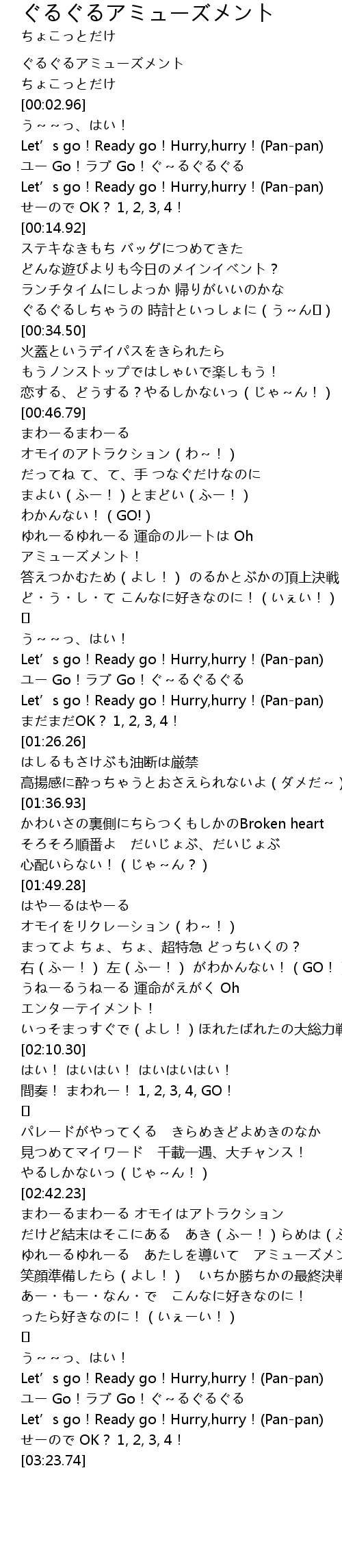 | [01:18.86] | ユー Go!ラブ Go!ぐ~るぐるぐる |