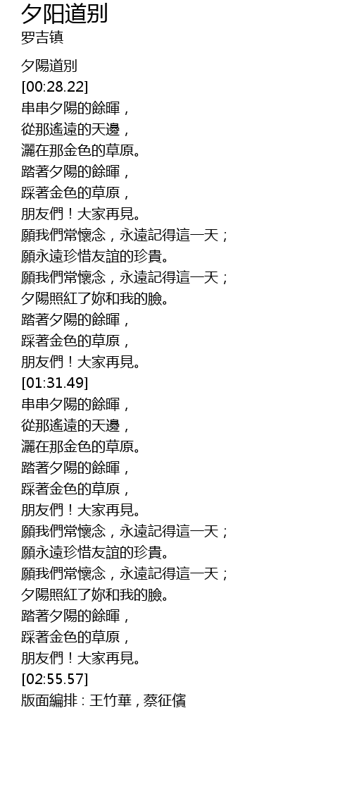 | [02:59.92] | 版面編排 : 王竹華 , 蔡征儐 |