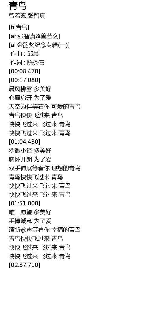 | [01:36.000] | 青鸟快快飞过来 青鸟 |