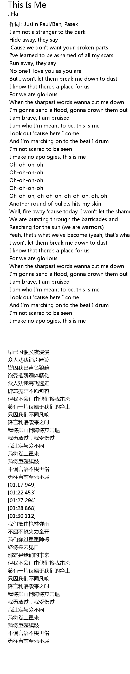| [00:59.170] | I am who I' m meant to be, this is me |