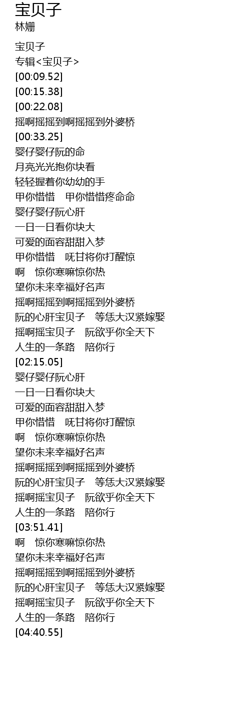 | [04:22.26] | 摇啊摇宝贝子 阮欲乎你全天下 |