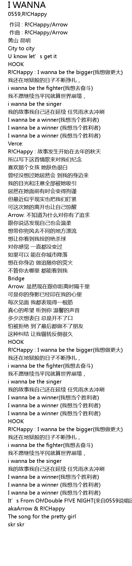 | [03:01.363] | R! CHappy : I wanna be the bigger wǒ xiǎng zuò gèng dà |