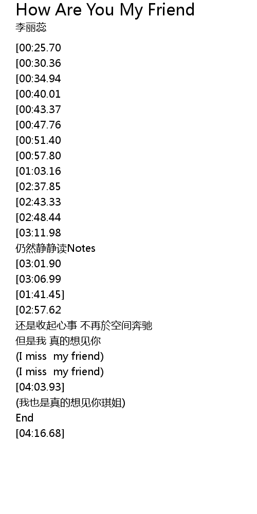 | [02:33.58][01:03.16] | How are you my friend |
