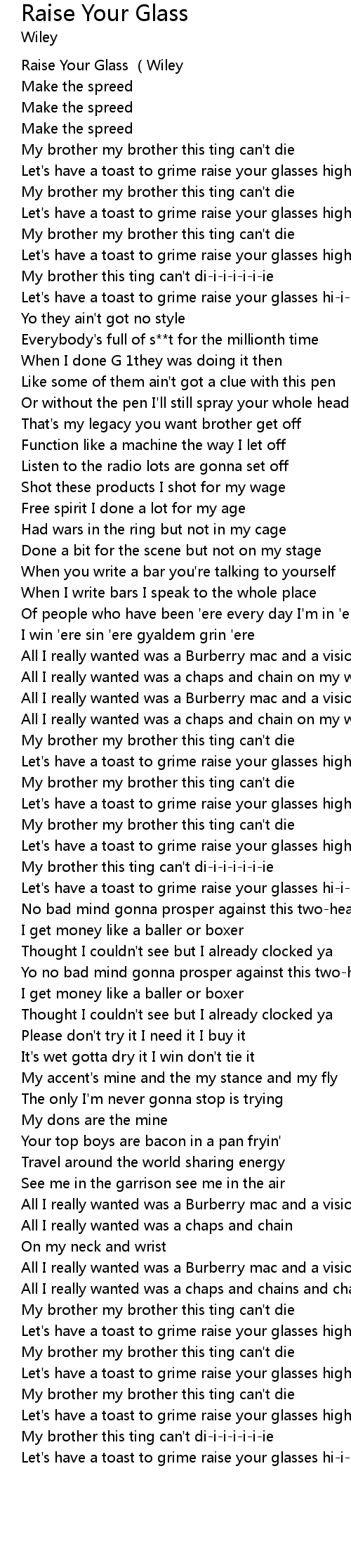 | [00:16.665] | Let' s have a toast to grime raise your glasses high |
