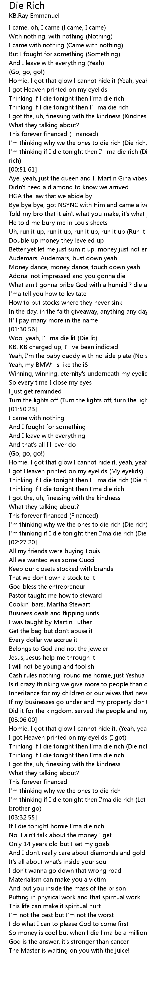 | [03:32.75] | If I die tonight homie I' ma die rich |