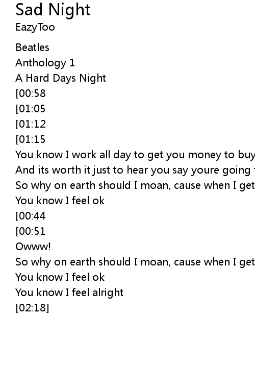 | [01:54][00:58][00:03] | Its been a hard days night, and I been working like a dog |