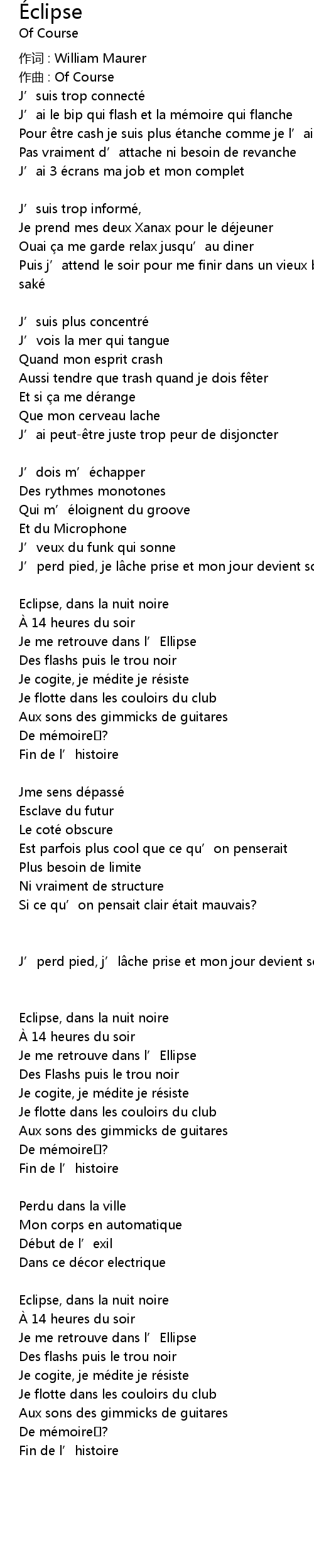 | J' perd pied, j' l che prise et mon jour devient sombre comme une | |