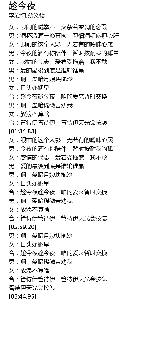 | [02:32.84] | 合:趁今夜趁今夜 咱的爱来暂时交换 |