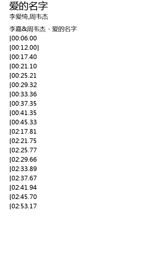 | [00:00.00] | 李嘉&周韦杰 - 爱的名字 |