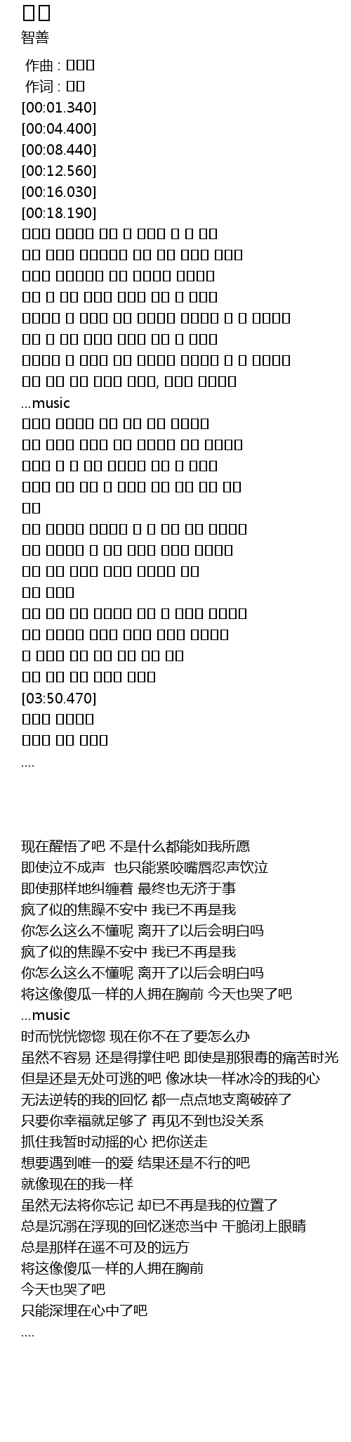 미칠 것 같은 조바심 속에서 더는 내 모습이 아닌걸요 왜 그렇게 그대 모르나요 떠나가면 알 수 있을까요 |