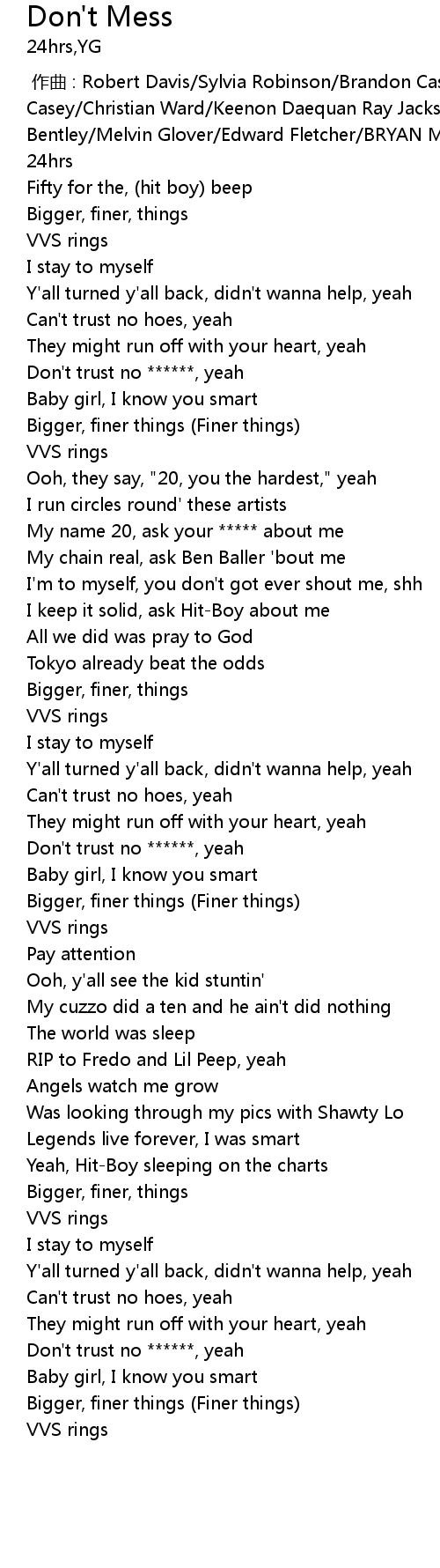 | [00:24.27] | Can' t trust no hoes, yeah |
