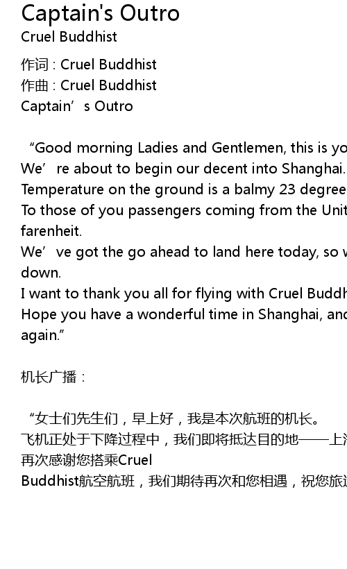 | 再次感谢您搭乘Cruel Buddhist航空航班,我们期待再次和您相遇,祝您旅途愉快!再见!” |