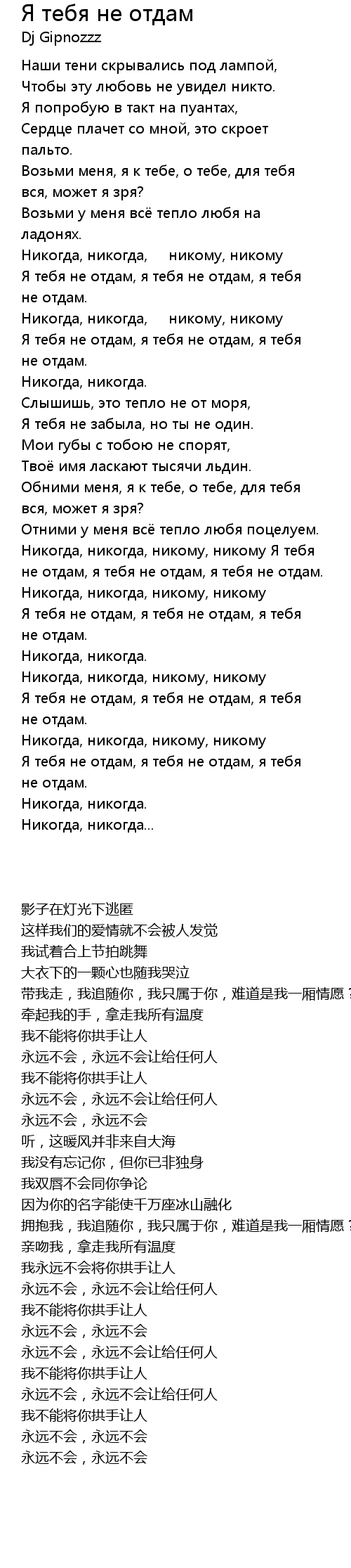 Никогда, никогда, никому, никому Я тебя не отдам, я тебя не отдам, я тебя не отдам. |