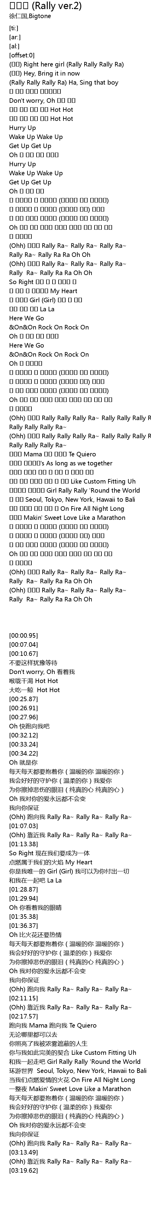 | [02:06.54] | (Ohh) 달려와 Rally Rally Rally Ra~ Rally Rally Rally Ra~ |
