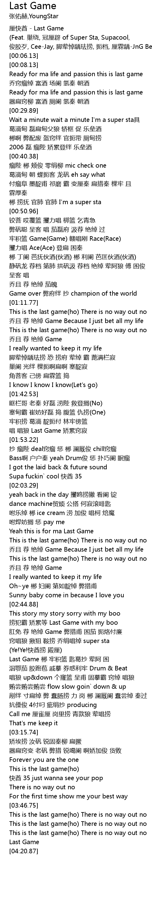 | [02:55.15] | Last Game chēn láo jī lán shi gé chāo hūn ā kùn |
