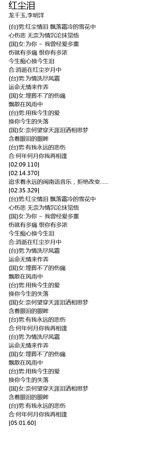 | [02:42.190] | tái nán: hóng chén qíng lèi piāo luò shuāng lěng de xuě huā zhōng |