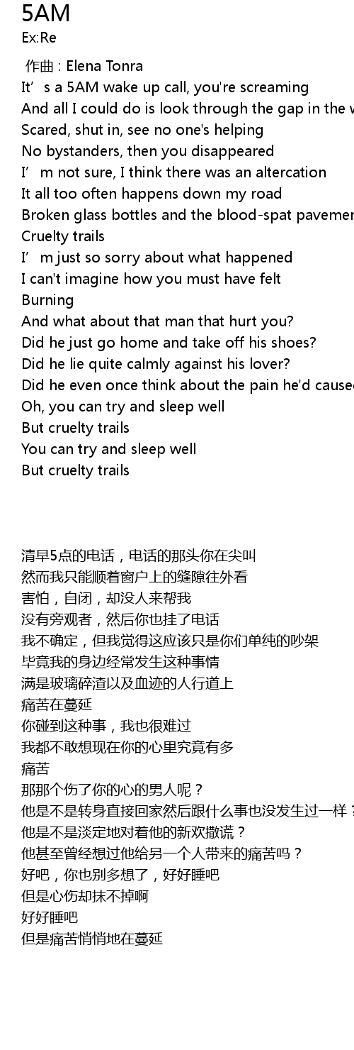 | [00:15.60] | It’s a 5AM wake up call, you're screaming |