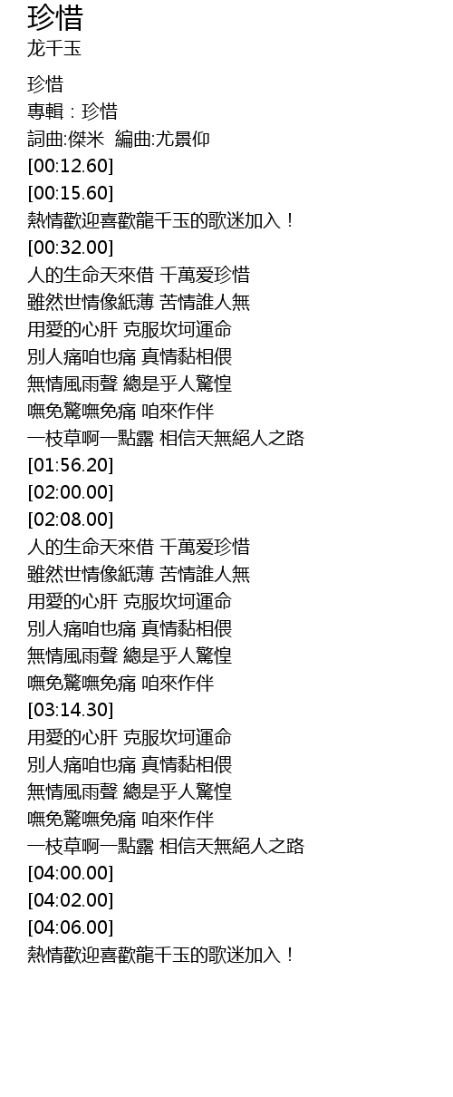 | [04:10.00] | 熱情歡迎喜歡龍千玉的歌迷加入! |