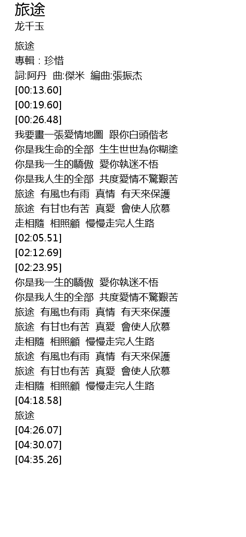 | [03:35.96] | 旅途 有風也有雨 真情 有天來保護 |
