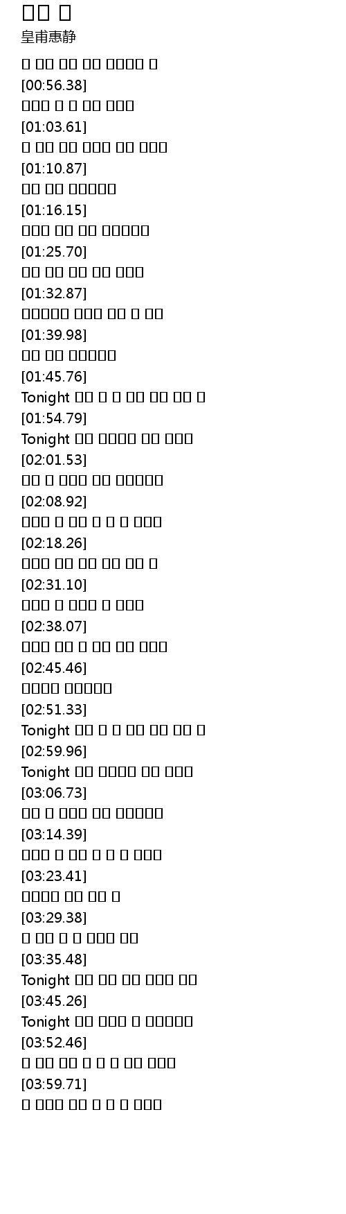 | [02:54.17] | Tonight 이런 내 맘 모두 네게 감춘 채 |