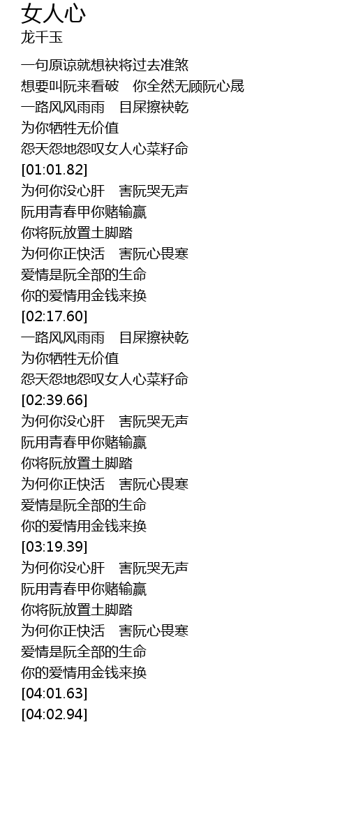 | [02:31.57] | yuàn tiān yuàn dì yuàn tàn nǚ rén xīn cài zǐ mìng |