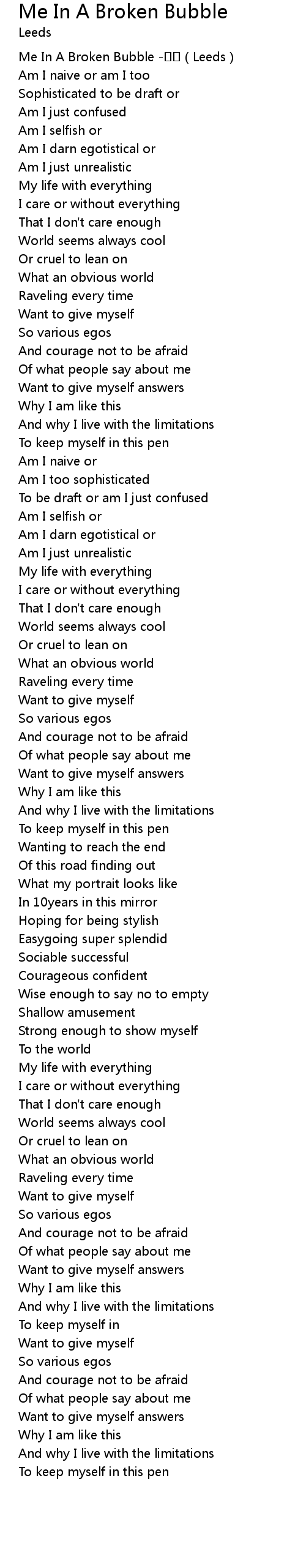 | [00:00.416] | Me In A Broken Bubble Leeds |