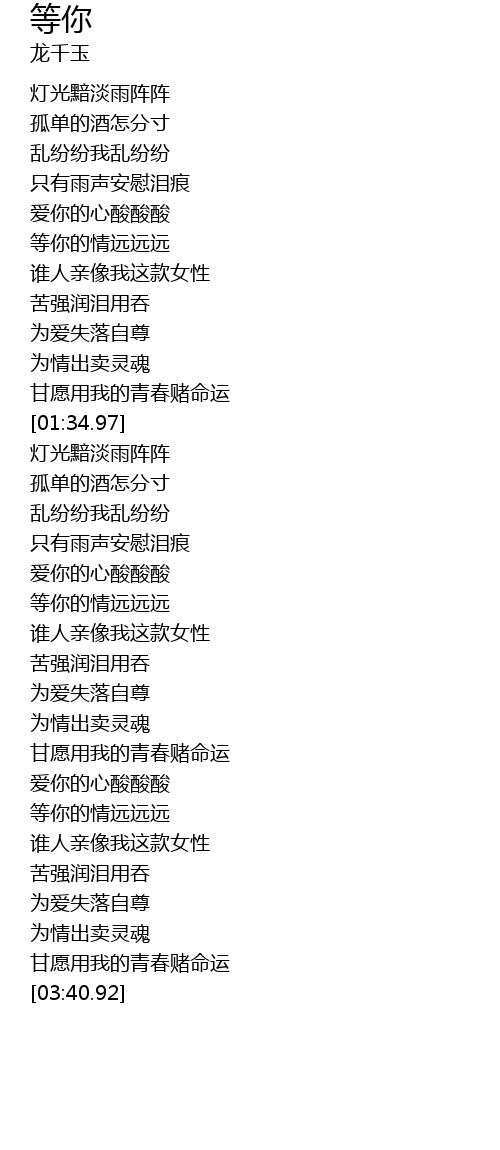 | [01:01.65] | deng ni de qing yuan yuan yuan |