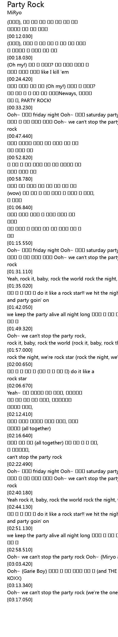 | [02:58.610] | Ooh~ we can't stop the party rock Ooh~ (Miryo aka Johoney) |