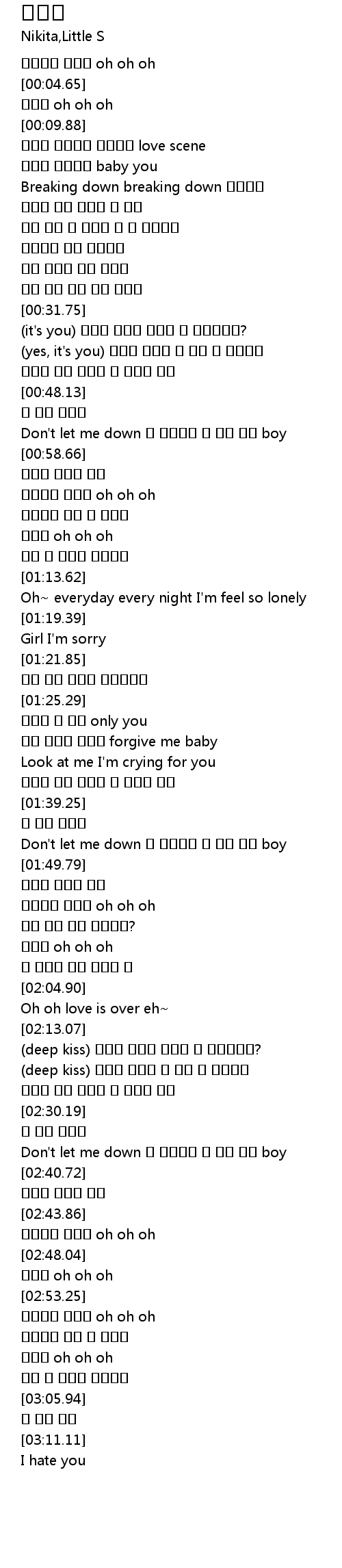 | [01:43.32] | Don't let me down 말 시키지마 더 듣기 싫어 boy |